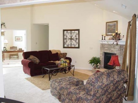 Ideal Suburban Home's ranch style August Home Plan offers 3 bedrooms and 2 bathrooms in 1412 sq. ft. of living space and a 502 sq. ft. 2 car garage.